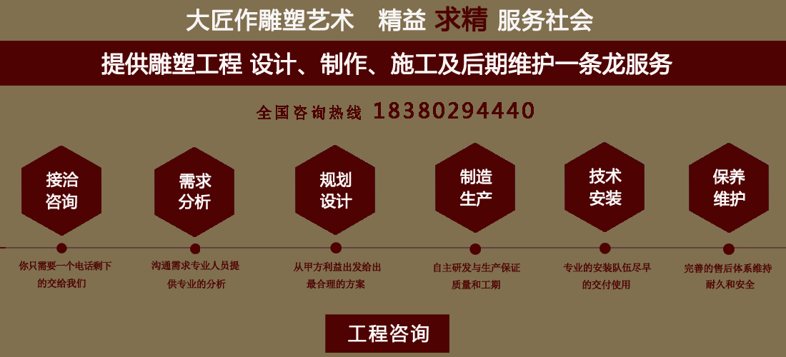 成都大匠作雕塑有限公司,是經(jīng)成都工商局審定注冊的正規(guī)專業(yè)雕塑制作及工程安裝服務(wù)機(jī)構(gòu),是由一群年輕富有朝氣的年輕人創(chuàng)辦,發(fā)軔于四川省成都市龍泉驛區(qū)。它是一家******于創(chuàng)作、制作和銷售為一體的公司。大匠作擁有多年從事公共藝術(shù)的專業(yè)人員和雕塑制作人組成的核心團(tuán)隊(duì),為您提供專業(yè)、具創(chuàng)新的設(shè)計(jì)及制作服務(wù)。公司成立以來,秉承“******服務(wù)、誠信為本”的宗旨,以客戶需求為目標(biāo)導(dǎo)向,不斷學(xué)習(xí),進(jìn)取,優(yōu)化和提高服務(wù)質(zhì)量,公司向您******——“您的滿意***是我們的信譽(yù)”,我們將以飽滿的熱情和******的服務(wù)贏得您的贊譽(yù)和支持。 愛心,細(xì)心,耐心,責(zé)任心是我們的要求,盡心盡職,為您打造出創(chuàng)新、專業(yè)、******的設(shè)計(jì)方案,我們堅(jiān)信先做人、后做事,用心對待客戶,實(shí)行透明收費(fèi),人性化服務(wù),本著對客戶負(fù)責(zé),對客戶負(fù)責(zé),更是對自己發(fā)展負(fù)責(zé)的態(tài)度,爭取做到讓每位客戶滿意
